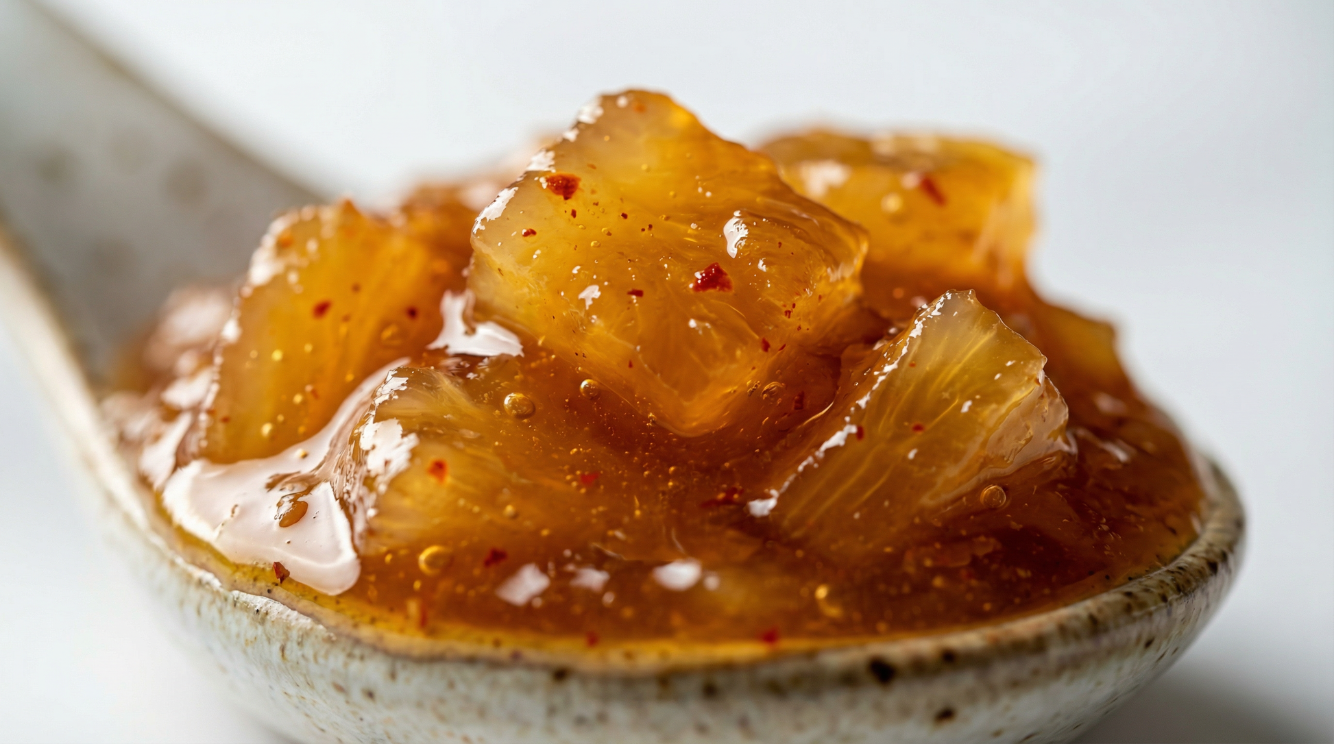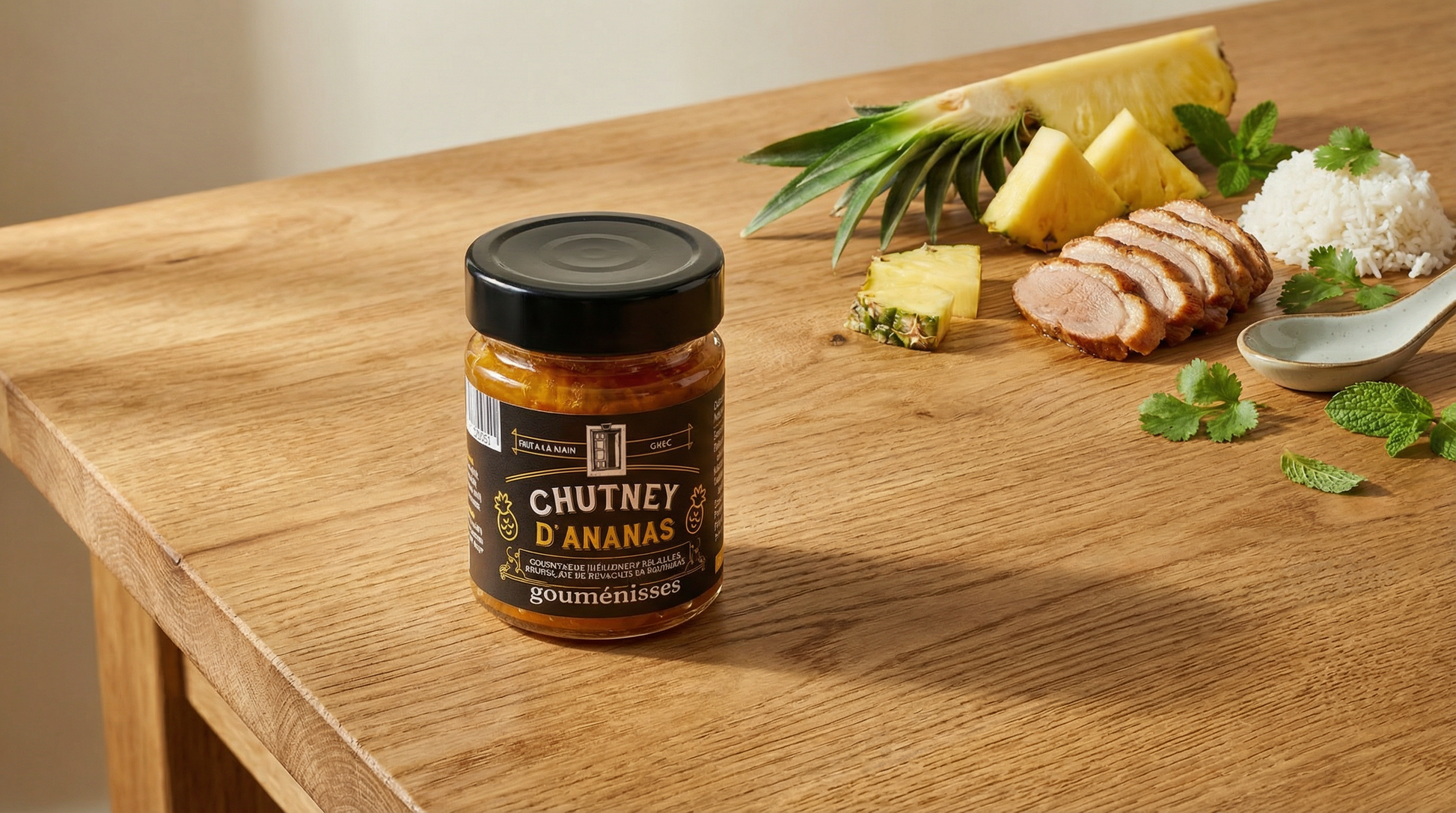 Laissez-vous transporter sous les tropiques avec notre chutney d'ananas. Nous utilisons des ananas frais, juteux et sucrés, que nous faisons mijoter avec une pointe de piment et des épices exotiques. Le résultat est une explosion de saveurs en bouche : la douceur de l'ananas, une légère acidité, et une chaleur subtile qui vient titiller le palais. C'est le condiment qui réveille les papilles et apporte une touche d'originalité à tous vos plats.
