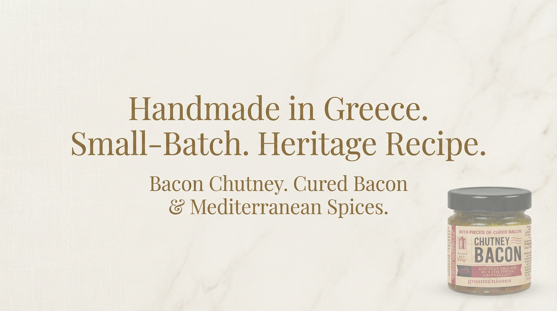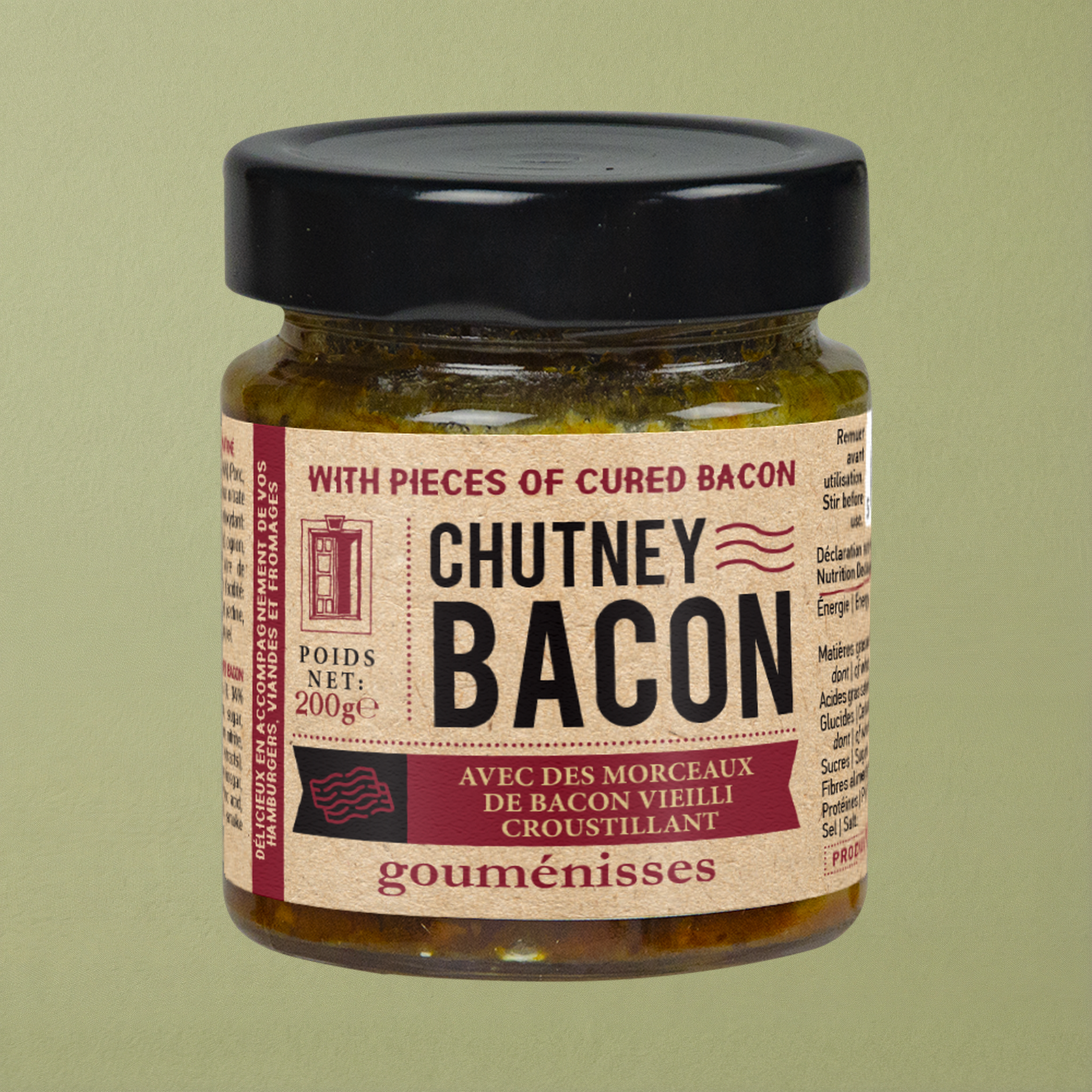 Attention, produit hautement addictif ! Nous avons osé l'impensable : un chutney où le bacon est la star. Imaginez du bacon fumé de qualité, lentement confit avec des oignons, du vinaigre de cidre de pomme et des épices. Le résultat est une bombe de saveurs umami, à la fois fumée, sucrée et acidulée. Ce n'est pas un condiment, c'est une expérience. Le secret pour transformer n'importe quel plat simple en un festin.